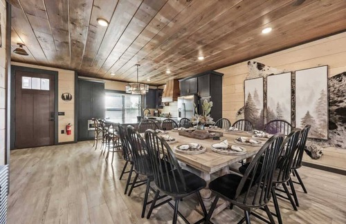 Black Bear Hideaway is where the Smoky Mountains come alive! Kids get their own epic game level with bunk beds, while adults sip and relax in the rooftop speakeasy lounge! Dive into the indoor pool, soak in the hot tub, roast s’mores by the fire, or battle it out in the game room or enjoy a movie in your private movie theater! And the FREE brand‑new resort waterpark? Pure all‑ages excitement you’ll never forget!