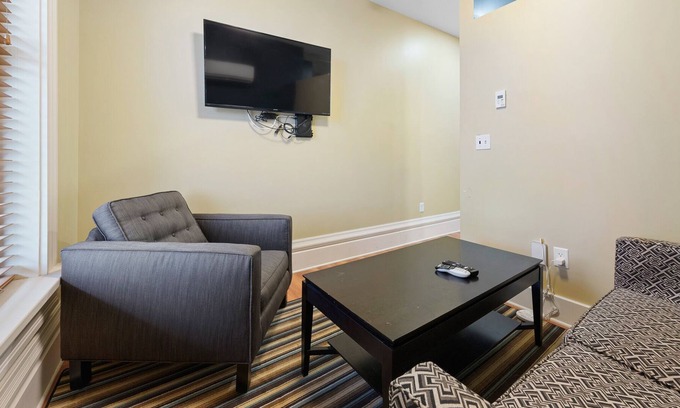The unit features a cozy living room with a comfortable sofa, a flat-screen TV, and plenty of natural light. The bedroom boasts a plush full-size bed, a dresser, and a closet for ample storage. The bathroom is clean and modern with a shower/tub combo. The fully-equipped kitchen includes a refrigerator, stove, microwave, marble countertops, and coffee maker, along with all necessary cookware and utensils. Not to mention in-unit laundry!