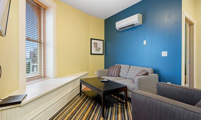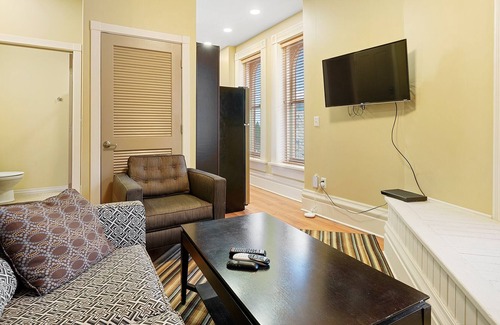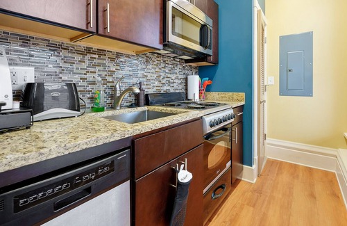 The unit features a cozy living room with a comfortable sofa, a flat-screen TV, and plenty of natural light. The bedroom boasts a plush full-size bed, a dresser, and a closet for ample storage. The bathroom is clean and modern with a shower/tub combo. The fully-equipped kitchen includes a refrigerator, stove, microwave, marble countertops, and coffee maker, along with all necessary cookware and utensils. Not to mention in-unit laundry!
