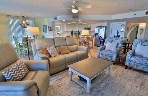 The spacious living area features a leather wraparound sofa, perfect for unwinding after a day at the beach. Each room in the condo has its own sliding glass door that opens onto a sun-filled, 3,000-square-foot private patio — complete with ample lounge seating and a dining area for enjoying meals outdoors.