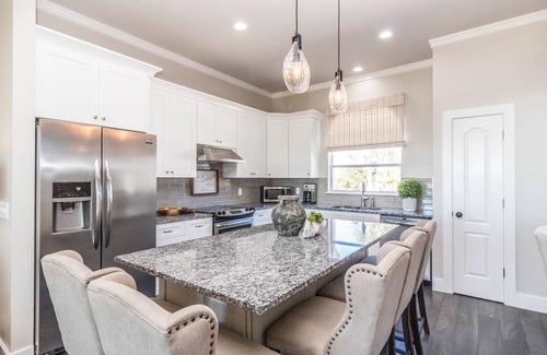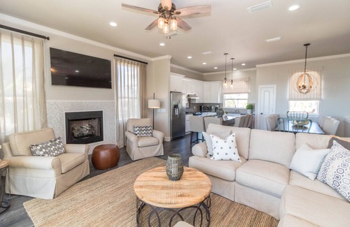 This home has been totally remodeled inside and out. Including all new furniture, flooring, new HD Smart televisions, bedding/linens and décor. The top floor of this home has an open concept kitchen, living and dining room. The dining area includes seating for eight (8) and a breakfast bar that seat five (5).