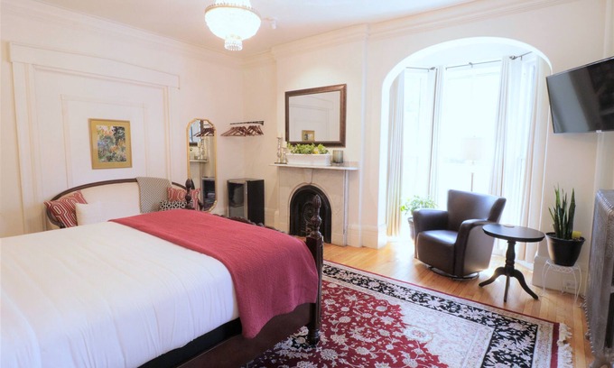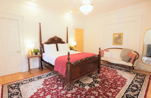 ROOM 1: This traditionally appointed room features original hardwood floors on which a queen size bed sits. Adding to the comfort of this bright & sunny room is two sitting areas & a marble ensuite bathroom (w/ double shower heads!). The room also comes with one off street parking spot a block away.