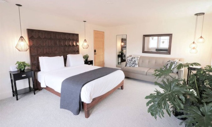 ROOM 4: By far our most spacious room, it is located on the third floor and has plenty of windows to bring in an abundance of afternoon sunshine. A queen bed, oversized headboard, sofa, and plants make up this bright retreat. The room also comes with one, off street parking spot just one block away.