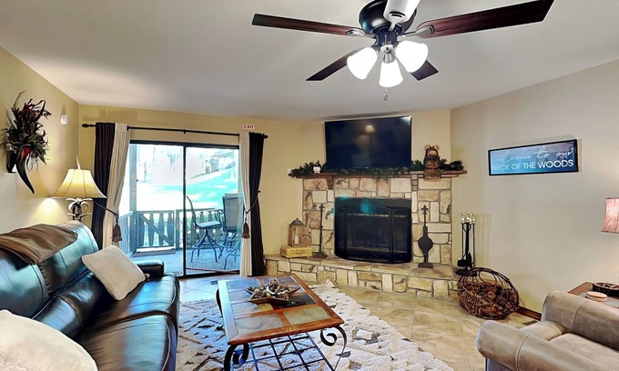 Step inside to an inviting living space with a stone-stacked fireplace, large Smart TV, and wet bar, ideal for cozy nights in. The open kitchen boasts stainless-steel appliances, a Keurig for your morning cup, and easy barstool seating, with a spacious dining table ready for shared meals. Step out onto the balcony to dine al fresco, fire up the gas grill, and take in peaceful golf course views.