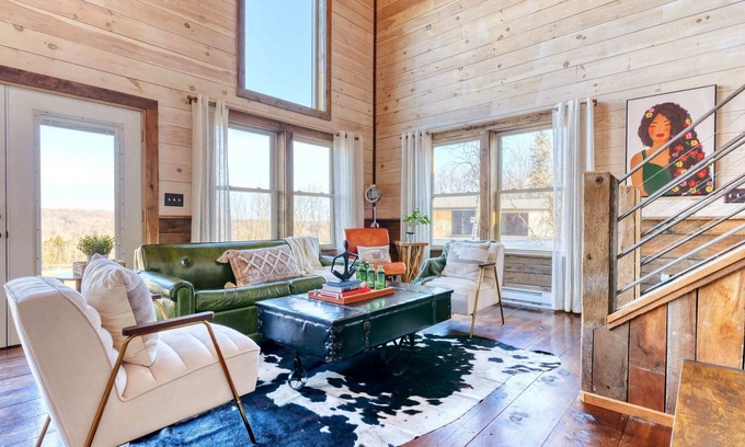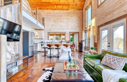 Welcome to our cozy yet spacious Poconos cabin, where rustic charm meets modern comfort. With 20' vaulted ceilings and warm wood interiors, this 2-bedroom, 2-bath retreat sleeps up to 8 guests. The lofted king master ensuite offers privacy while overlooking the open-concept living space below, and a second king bedroom on the main floor shares access to a full bath.