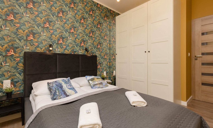 Modern apartment with balcony can comfortably accommodate up to 4 people. The 47,5 m² apartment consists of a living room with a double sofa bed, a fully equipped kitchenette, a separate bedroom with a double bed and a bathroom with a bathtub and a toilet. The living area with access to a furnished balcony is the perfect place for rest and relaxation. The apartment's interior is stylishly finished in a tasteful and warm color scheme, and comprehensive furnishings take care of the comfort of each stay. Among the amenities is air conditioning, which will maintain an optimal and customized temperature in any weather. Amenities also include multimedia devices (flat-screen TV and free Wi-Fi) and full bathroom and kitchen facilities, such as a washing machine and dishwasher. A complimentary toiletries, towels and linens are provided for a good start to your stay. The property's space is functionally designed, meeting all guests' needs. In addition, guests traveling by car can park in a private space in the underground parking lot.