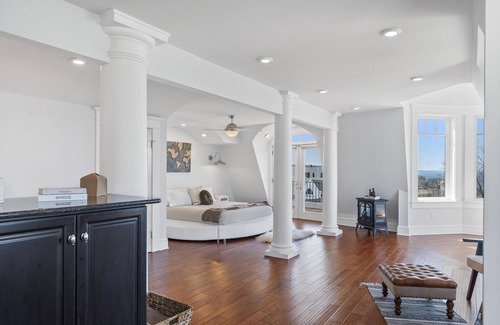 Bedroom: The bedroom is beautifully appointed, featuring plush bedding and elegant decor. Wake up to the sight of the bay through large windows, creating a tranquil ambiance.