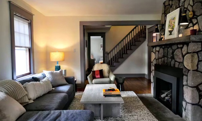 The four bedrooms are on the second floor, Bedroom 1 and 2 both feature king sized beds. Bedroom 3 has two twin sized beds, and Bedroom 4 has a twin sized bunk bed, along with a connecting door to Bedroom 1. Every bedroom is fully furnished for a comfortable stay with area rugs, dressers, bedside tables and lamps. There is an ample supply of luxurious bedding from Brooklinen with plenty of extra sheets, pillows and towels. The family room on the ground floor has a queen sized sleeper sofa for extra guests.