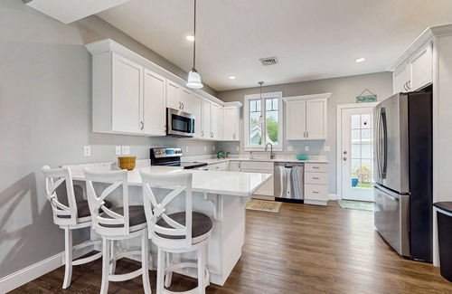The cottage is beautifully decorated with beach-themed decor, creating a pleasant and restful vacation atmosphere. Both bedrooms feature premium plush king-size beds, large closets, and access to their own full baths—one with a walk-in shower and the other with a tub/shower combination.
