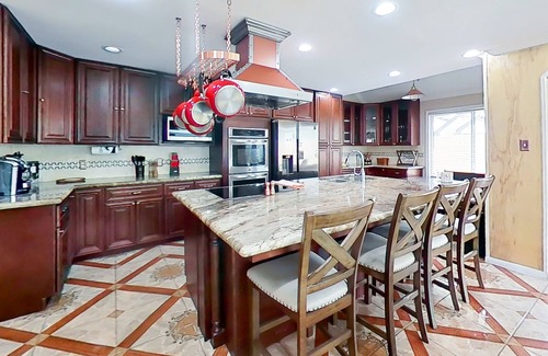 At your vacation home, a bright, vast interior sporting classical charm awaits. The group chef will adore the well-equipped kitchen. Everyone can lounge inside or hang out in the large enclosed yard as the kids frolic while the cook works their magic. Though relaxation is a given here, there are several desks that are great for catching up on some remote work. A highlight is easily the sauna in the upstairs bathroom. Soothe aching muscles there, in the walk-in shower, or in the soaking tub before winding down on the plush bedding in one of the bedrooms.
