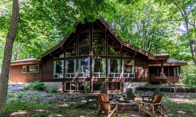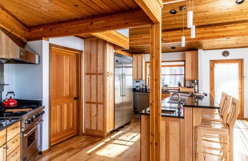 Experience a getaway like no other at this architect-designed and built Timber Frame home! Offering plenty of space to bring your entire family along and a relaxing hot tub right behind the home, this retreat is all about charm and convenience. The open floor plan seamlessly combines the kitchen, living room, and dining room to enhance togetherness during your trip. Unbelievable floor-to-ceiling windows are the star of the living space, letting you all admire incredible tree views. Gather around the fireplace for a snuggly afternoon at home. The kitchen comes equipped with stainless steel appliances and all the cooking essentials to prepare mouth-watering meals, refreshing beverages, and more.