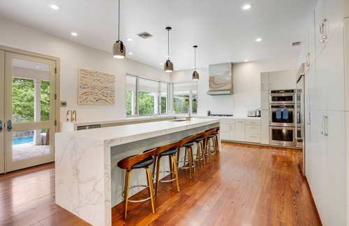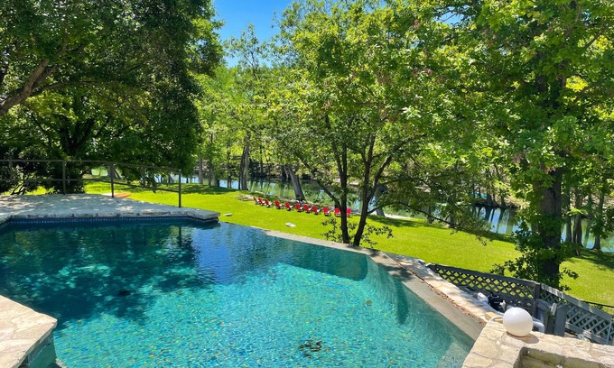 Escape the everyday and experience the extraordinary when you spend your getaway in warm and sunny Texas. This spacious and stunning home has room enough for a large family or travel group to vacation comfortably together, with a glittering pool and pool spa in the backyard and a tranquil view of the passing river. A fantastic outdoor entertaining space sets this home apart from all others! An outdoor fireplace, large TV, outdoor kitchen with two refrigerators and a wine fridge, and plenty of comfortable seating make this spot desirable for gathering for events and making unforgettable memories. The outdoor space has dining for 12 with seating for 25.