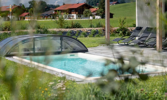 Enjoy your vacation in the newly built chalet in Inzell! Relaxation is guaranteed here with a private outdoor pool (open depending on weather May to September) and a private sauna. Relax and enjoy summer evenings on the spacious poolside terrace with direct views of the Chiemgau Alps. The Inzell holiday resort is surrounded by the local Chiemgau and Berchtesgaden Alps and in the immediate vicinity of the Inzell spa and bathing park (650 m above sea level). Experience the impressive Inzell landscape, which is characterized by a sunny valley and picturesque mountain meadows and mountain lakes, and enjoy the wonderful panorama on the mountain forest and moor adventure trails on a hike or bike tour. In winter there are excellent opportunities for ice skating and skiing. The winter sports facility Max Aicher Arena is located in the village itself, the winter sports areas Kesselalm Lifte Inzell and Pommernlift in Adlgaß are in the vicinity. Inzell itself offers fantastic conditions with 80 km of cross country ski slopes with direct access at the door. In addition to the Kaltenbach ski area, the Winklmoos Steinplatte and Lofer ski areas are nearby. Highlights: WiFi, consumption-based energy costs, bed linen and towels included in the rental price, Chiemgau card as a free additional service Nearby activities include hiking and mountaineering in the Chiemgau Alps, with Chiemsee, Königssee, and Waginger See just a short drive away. Families will enjoy the Badepark Inzell, featuring an indoor pool, giant slide, and natural bathing lake. Inzell also has the Max Aicher Arena, an indoor ice rink with a 400m speed skating track and an ice hockey rink. In winter, the Kesselalm lifts are 2.5 km away, and the Pommern lift is 5 km away.