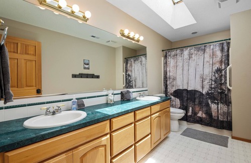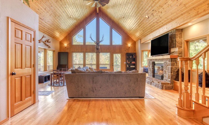From the moment you enter, you will be enveloped in a warm mountain lodge feel. The main living room is bathed in natural light from its vaulted cathedral ceilings and oversized windows. Enjoy the huge sectional facing the fireplace and stream your favorite movie on the 75” TV. It’s a perfect place to relax with your entire guest group. You’ll find a desk area with Starlink wifi for your work needs. There’s also an area for little kids with a play kitchen, table, books and toys.