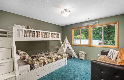 Ascending to the top floor you will find a loft with a sitting area that has two convertible sleeping chairs which are perfect for kiddos or guests if needed. Down the hall you’ll find the second master suite with ensuite bathroom. It boasts a king bed and air mattress. The two additional bedrooms on this level share the third full bathroom. The first is a fun room with a twin over full sized bunk bed, a futon couch that converts to a full sized bed and kids teepee with books, toys and a wooden train set! The final bedroom has two XL twin beds, it has lots of natural light with windows overlooking the front lawn and a beautiful view.