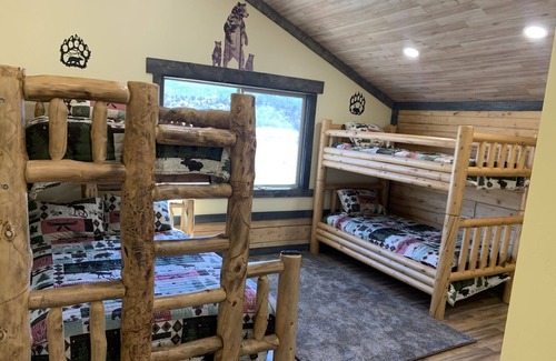 There are 2 bedrooms and 2 full baths. Bucks Room has a Queen bed and a twin bunkbed. The Bears room has a twin over queen bunk and a twin over twin bunk bed.