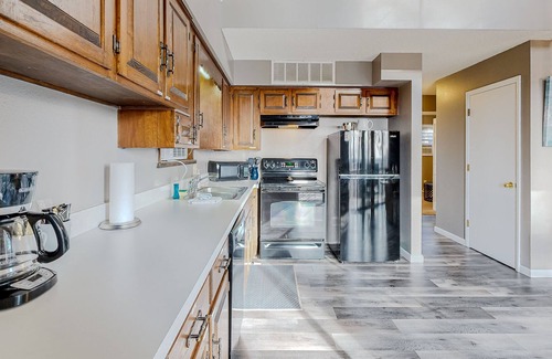 This A-frame style duplex is perfect for couples or small groups. High ceilings ensure the interior feels spacious. And two patio doors open to even more room to spread out. The well-equipped kitchen is at your disposal for whipping up tasty meals. Eat at the large dining table for family-style meals or dine alfresco and enjoy the view. After a fun day out and about, you’ll ove returning to this living room, which includes comfy seating and a wood stove.