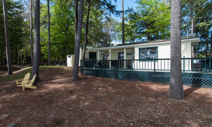 ******This is an island property that requires the renters to have a boat to access the property.******* The property has a dock on the northeast side, and a dock and swim platform on the southwest side. Everywhere you look is a view of Lake Winnipesaukee.The main cottage is just under 1,000 square feet. There is a main bedroom with a queen bed and a half bathroom. The family room overlooks lake Winnipesaukee toward Mink Island. The kitchen has a stove, microwave, water cooler, and over looks the lake toward Timber Island. A deck wraps around the entire cottage and also connects the cottage to the water closet, and to the bunk house. The water closet is a building that has a sink, shower, toilet, and a washer and dryer. There is also an outside shower so you can get even closer to nature lol. The bunk house has two sets of twin beds, a daybed, and a TV. Outside the bunk house is its own deck with two chairs and a table. Great place to have a morning coffee. There are four kayaks, swim mats, floats, paddle boat that are available.