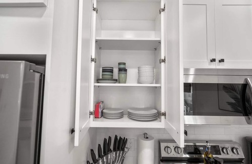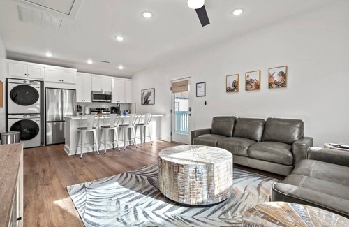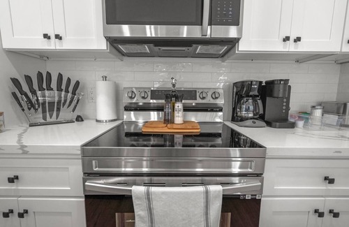 The kitchen is well-stocked and the perfect space for groups that like to cook together. Fully equipped with glasses, mugs, plates, bowls & silverware for 4. Coffee/Tea Bar includes drip coffee maker, Keurig, and electric kettle. Blender, toaster, and microwave included. Electric stovetop range + oven. Pots/pans, baking sheet, oil, salt & pepper.