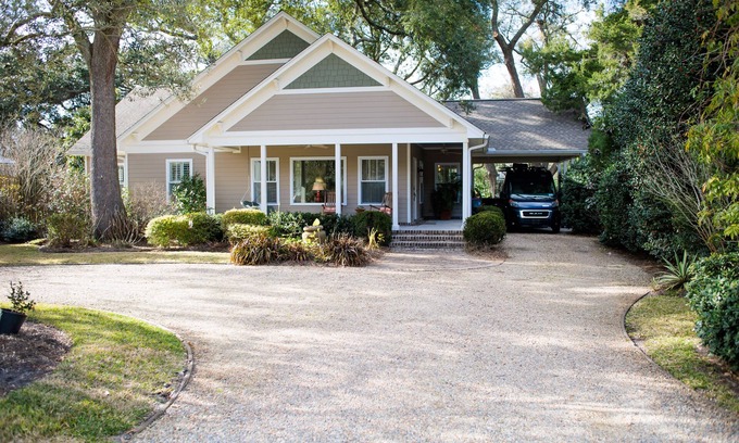 A modern craftsman-style home nestled under a beautiful canopy of large oaks welcomes you and your family. The front entrance offers a drive-through driveway that makes entry and exit with larger vehicles a breeze. And if you’re a larger party, ample parking is provided.