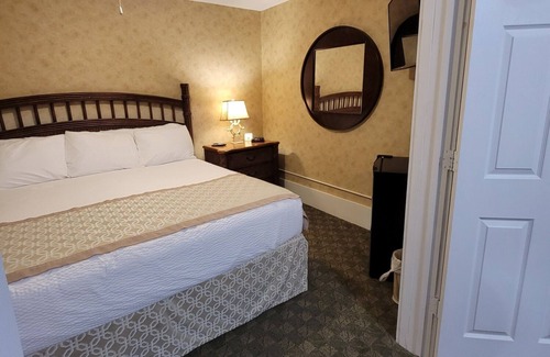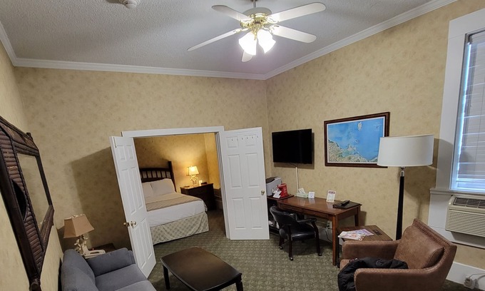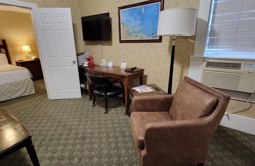 You will enjoy the comforts of a king bed, a separate living area furnished with a plush sofa with chase, a classic club chair, workspace with desk and chair. You also have the convenience of 2 large TVs (bedroom and living area), mini refrigerator, microwave, mini-ice maker, Mini-Keurig Single Cup, in-room safe and USB charging ports. 3rd person sleeping option is atop the sectional sofa. additional bedding is provided. Please indicate at time of booking if needed.