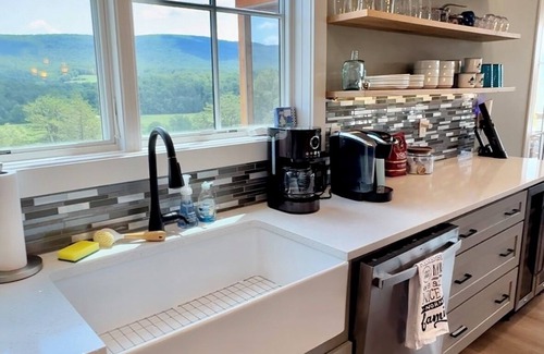 Inside, there’s room for everyone to unwind. The main floor’s open kitchen and living room are perfect for gathering, while the downstairs rec room offers ping-pong, air hockey, games, and a TV with Netflix and DisneyPlus. Roast s’mores by the fire pit under the stars or start your day with a stunning sunrise on the porch—it’s a Shenandoah escape like no other.