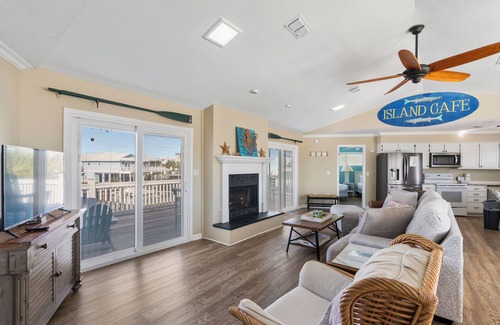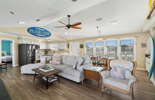 Island Oasis is a cheerful home with two bedrooms and two baths accommodating up to six. Bright and colorful decor welcomes you into this spacious waterfront home with gorgeous canal views, while cozy interiors encourage afternoons spent lounging the days away. Prepare delicious meals in the large, sunlit kitchen and savor your tasty dishes on the large back deck or front porch. Gather together for board games, a movie, or just casual conversation in the living room with plenty of room for friends and family. Take in stunning sunsets on the covered outdoor area while the kids relax on the swing overlooking the canal. It’s easy to drift off to sleep after a day of sun and sand in this quiet neighborhood designed for relaxation. Retreat to the master suite with a king-sized bed or the guest suite with two queen-sized beds, both featuring private access to the large deck outside. A full-sized washer and dryer, sand toys, parking for a boat trailer,, three kayaks, and room for three vehicles are additional conveniences to enjoy during your stay.