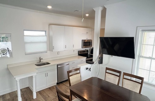 Island Paradise features two cozy bedrooms, each thoughtfully decorated with a coastal theme to enhance your Key West experience. The Master Bedroom has an ensuite bathroom. The open-concept living area boasts comfortable seating, a flat-screen TV, and large windows that fill the space with natural light.