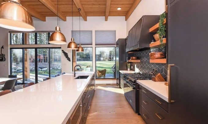 Kick back and relax in this calm, stylish space. Brand new home on a quiet private acreage with a forest campground add on High end features like wine fridge / keg fridge at the bar , premium Japanese toilet, heated indoor parking, large hot tub, a children’s playground and much more. You may have a hard time checking out.