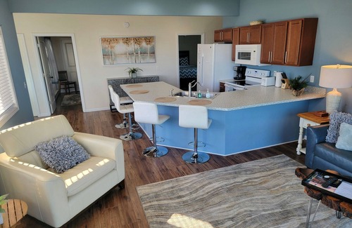 Each bedroom has a new queen mattress. There is a shared bathroom and a stackable washer/dryer. The open great room has a nice kitchen with coffee maker, blender, dishes, pans, etc., counter bar, electric fireplace, comfortable bar stools, smart TV and walkout to deck. This is a main-level unit with no stairs and direct car access to the unit. Located directly across from the area hospital. Call for off-season availability for longer-term stays, and corporate or work-related lodging. Motel construction is happening across from the property- projected to continue through May 2024.
