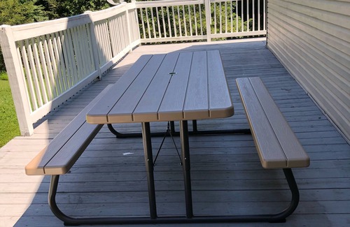 Outside and a picnic table and chairs.its a family and friends adventures. It is a great adventure for the whole family and friends. You can also