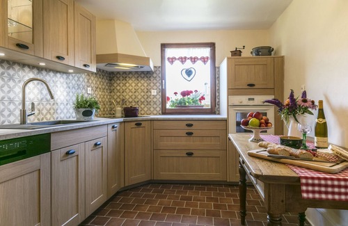 The house probably dates back to the 17th century. In earlier times, it used to be the workshop of a cooper. In 2007, we bought the house, renovated parts of it, and have modernized it further over time. We have decorated this jewel, paying attention to details to keep them as authentic as possible, always with a reference to Hunawihr, which is among the most beautiful villages in France. Be inspired by the charm and historic ambience of your holiday home with its impressive timber-framed inside and the all the modern comforts. You will find a holiday paradise on a space of 150 square metres –enough space for families with children or 8 adults. It is important to us that you could feel good and be excited to stay here, and we hope to count you among our regular guests soon. In this sense, we look forward to meeting you!