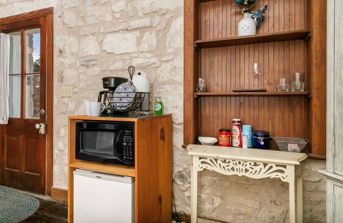 The Itz Inn offers guests an unprecedented location right in the heart of the Main Street, adjacent to Hondo's (named after the famous Hondo Crouch) which is one of Fredericksburg's most popular eateries.This is a true gem of a property providing an opportunity to literally step back in time; if the rock walls could speak - a thousand tales would be told.Comfortable spaces both inside and out - lounge area off bedroom and back patio for an evening glass of wine or a cocktail. Live music at Hondo's is an additional bonus on the weekends. ( Please note you are only renting a suite, not the entire home)