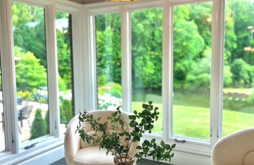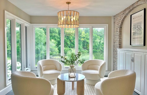 Enter through the front door and find the sunken atrium sunroom on your right. With wood floors, stunning views of the lake and windows on two sides, we think this is the ultimate day-to-night space. Morning sunrise yoga or meditation with the doors closed or a late-night dance party; no matter the vibes of your group this is your bonus space- make it into whatever works!