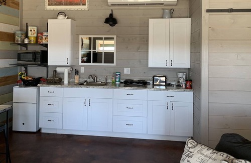 This room is one furnished bedroom, one bathroom. A living room with a hide away bed, and a full kitchen. The porch overlooks the ranch so you can enjoy the scenery and sounds with your morning coffee.
