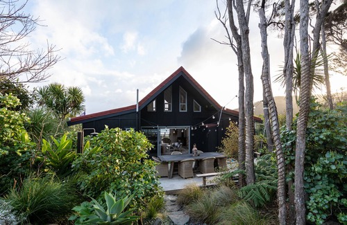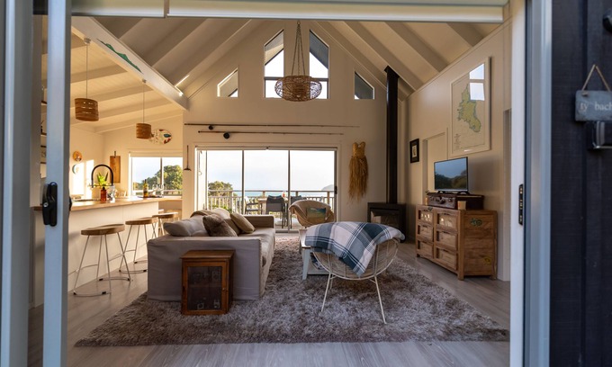 A luxury boutique home with stunning views of the sparkling blue Tryphena Harbour on Great Barrier Island. Beautifully appointed with premium soft cotton bedding, bath robes, beach towels, coffee machine, internet, gas fireplace, stunning modern bathroom, garden shower and a beautiful double bath set privately in the bush to enjoy our stunning Dark Sky Sanctuary nights. A quick three minute walk to beautiful beaches, the Irish pub, cafe and local store. Two bedroom one bathroom with large front and back decks with amazing sea views. Lemon, lime, and mandarin trees and herb and salad garden for you to use at your leisure.