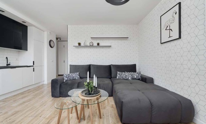 This modern 58 m² apartment offers comfortable accommodation for 8 people. It is an ideal choice for a trip to Wroclaw with family or friends. The apartment consists of a spacious living room with a kitchenette, two bedrooms equipped with comfortable sofas and a bathroom with a bathtub and shower. In addition, the apartment has access to a balcony with a lounge area where you can enjoy your morning cup of coffee. The interior finish in shades of white and gray and the fashionable furnishings give the apartment an exceptionally tasteful atmosphere. It is an excellent choice for anyone who appreciates comfort and functionality, but also aesthetics. In addition, the apartment is filled with natural daylight, making the apartment bright and pleasant. The functional layout of the rooms and comprehensive equipment with necessary kitchen and bathroom accessories guarantee a successful stay. Multimedia equipment includes a TV and access to high-speed, free Wifi connection. Thoughtful layout of the rooms and private bedrooms will ensure a comfortable stay for the whole family. Thanks to the air conditioning installed in the interior, the temperature in the apartment is ideal, regardless of the weather outside the window. To facilitate the start of each arrival, a complimentary set of toiletries (soap, shampoo and shower gel), towels and linens are provided. Guests can park their cars in private platform spaces in the underground garage.