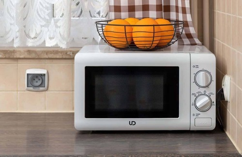 Gas cooker with oven, fridge with freezer, electric kettle, microwave, folding table, kitchen and tableware