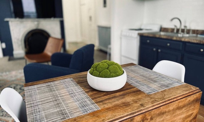 The living room has a fold down futon for 2 additional guests, with all of the needed linens. Relax in front of the beautiful original marble fireplace, plenty of lighting for a good read, watching a movie on the Smart TV or even working at the dedicated desk.