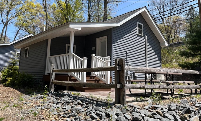 Located steps away from Lake Wallenpaupack, our Janes Cabin sleeps 4 people with a bedroom with a queen size bed and 2 twin beds in the loft. The cabin has a full kitchen complete with pots and pans, electric range, Keurig coffee maker, fridge, and microwave. A full bathroom with tub is also located on the first floor. Outside you'll find a charcoal grill, picnic table, chairs, and fire pit. Bringing up a boat? Ask about our dock slips or dry dock options.