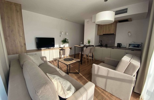 The modern studio offers a comfortable stay for 2 people. The interior of the apartment consists of a spacious living room with kitchenette, an elegant bathroom with shower and a sunny balcony from which you can enjoy the sea view in the distance. The balcony, equipped with comfortable garden furniture, is the ideal place to relax with a cup of coffee. The studio is distinguished by its modern design and high functionality, providing guests with exceptional comfort. On hot days, relief is provided by air conditioning, which ensures a pleasant coolness. In the living area, there is a comfortable sofa bed, which is the ideal place to relax during the day and turns into a comfortable bed to sleep on in the evening. A Smart TV will make evenings more pleasant by offering access to your favourite programmes and films. In addition, a desk provides a comfortable place to work, while high-speed Wi-Fi ensures uninterrupted connectivity. The kitchenette has been fully equipped with modern appliances such as a dishwasher, microwave, fridge-freezer, induction hob and all necessary kitchen utensils, allowing you to prepare your favourite meals with complete convenience. For the complete convenience of guests, the studio offers a washing machine for extra comfort during longer stays. A private parking space in the underground garage is also available, guaranteeing safe parking. The studio is pet-friendly, so four-legged companions are welcome here.