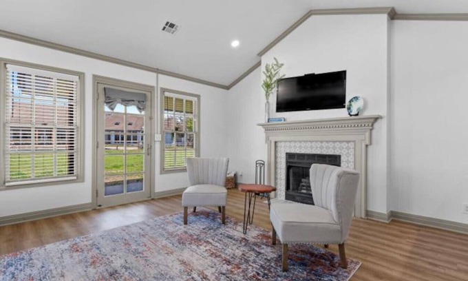 Kick back and relax in this calm, stylish space. This space has a wonderful kitchenette with full fridge, dishwasher, sink and lots of cabinet space! A vanity space, a nice tub and living room with pull out queen size couch, two comfy chairs, large tv and faux fireplace.