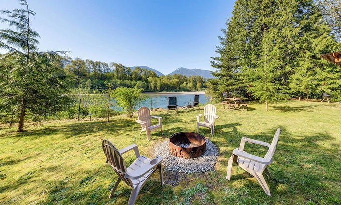 Escape to Jay's Salmon Run Retreat, a charming 2-bedroom house nestled right on the banks of the scenic Skagit River in Concrete, Washington. Whether you're seeking a relaxing retreat to soak in the hot tub and peaceful ambiance with stunning views of the river and mountains, an adventurous getaway to explore the North Cascades, or a fun-filled stay with disc golf, grilling, and cozy evenings by the fire, Jay's Salmon Run Retreat offers something for everyone.