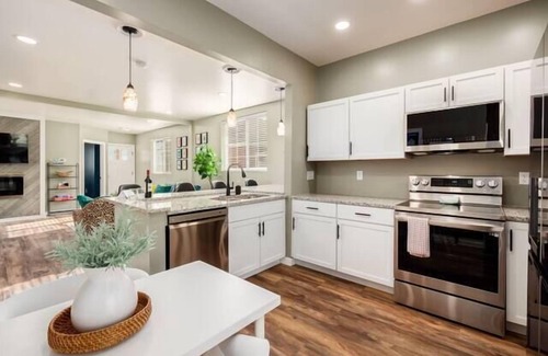 Elevate your travel experience and choose our exceptional home for your visit to Columbus, OH! This stunning 4-bedroom property has everything you need for a memorable stay. The main-level bedroom features a queen bed and a private ensuite bathroom. Upstairs, three additional bedrooms share a full bath—two with queen beds and one designed for fun, featuring bunk beds and arcade games.