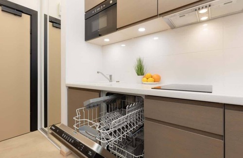 This comfortably furnished studio apartment can accommodate 2 guests. It consists of a living room with a kitchenette and a bathroom with a bathtub. A great asset is the air-conditioning that takes care of the appropriate temperature of the interior. Functional equipment of the apartment such as a dishwasher and a microwave allow to feel like at home, and entertainment is taken care of by multimedia such as a free wireless Internet connection and a flat-screen TV with cable and SmartTV access. The interior is warmly and tastefully decorated. Guests are provided with complimentary toiletries, towels and bed linen to start their stay.