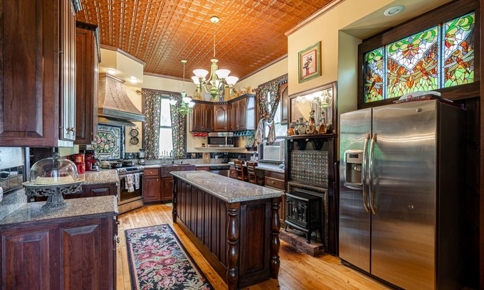 There is a full walk-through butlers pantry featuring china, glassware and flatware for your use. There are three vintage tin ceilings in the kitchen, master bedroom and east bedroom, a magnificent entry way, and a total of five fireplaces in the house, all are fitted with safe electric log-effect heaters. In the entryway there is a chinese screen-enclosed alcove with a trundle bed for a person wishing to reside on the ground floor.
