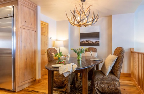 The townhome boasts three floors of spacious living space. It all begins on the ground level where a two-car garage leads into the ultimate basement for athletes with its indoor hot tub, sauna and full bath. Rise a floor and find the open living area, rich with rustic hardwood floors, fine furnishings and copious windows. A breakfast bar – accented by leather upholstered stools – rings the open, deluxe kitchen with pine cabinets and granite countertops. A dark wood dining table, surrounded by six upholstered chairs, overlooks the living room with its ample seating, towering rock fireplace and wall of windows. An outdoor deck literally sits on the ski slope. A powder room services the living space. The main floor also features one bedroom with a king bed, day bed and en suite bathroom.