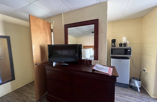 This unit has a flat screen TV, small microwave, personal sized refrigerator