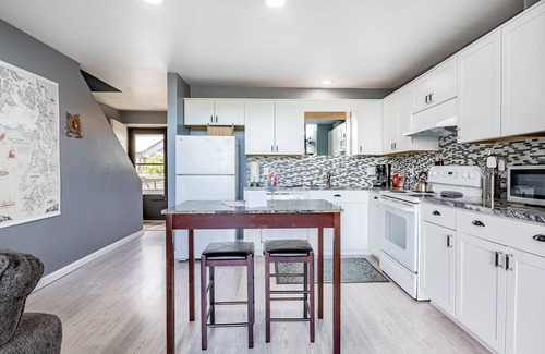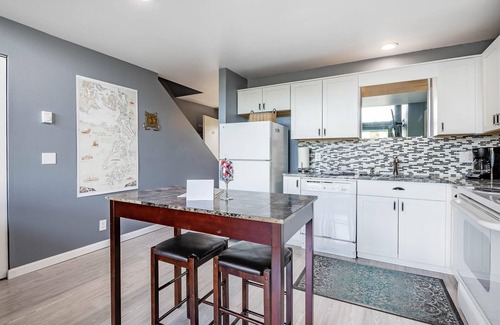 This remodeled 2 bedroom 2 bath condo is located at Jacobs Landing which is in the heart of Birch Bay central and within walking distance to much of what Birch Bay has to offer. This is an upper unit with stairs to the entry and stairs inside. When you enter the condo you enter on the main level which hosts a bedroom with twin beds, a full bath, washer and dryer, a fully stocked kitchen with pots, pans, dishes, silverware and more. The living room has a wood burning fireplace, nice sliding glass doors that go out onto a deck with a propane BBQ and great view of Mt. Baker. Upstairs there is Queen size bed and a bathroom with a tile shower. There is an opening that allows you to look down onto the living room. This property is located back by the clubhouse which has an indoor pool, hot tub, game room, racquetball court and outside a tennis court. Bike storage along with paddle board and kayak storage are there as well. You are less than a 3 minute short walk to the beach to watch the sunset or have a beach fire. This property comes with complimentary wifi.