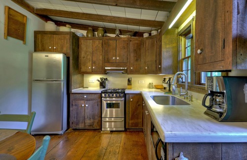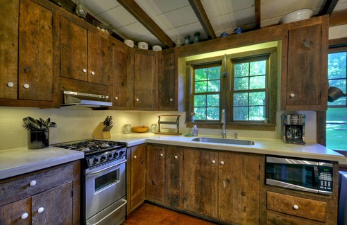 This primitive property features natural wood beams throughout, a wood burning fire place, stainless steel appliances and a gas range, with seating for 4 in the dining area. The master suite on the main floor has a custom Queen bed with a full walk-in stone shower. Upstairs is an open loft with a queen bed to complete sleeping for 4 guests.